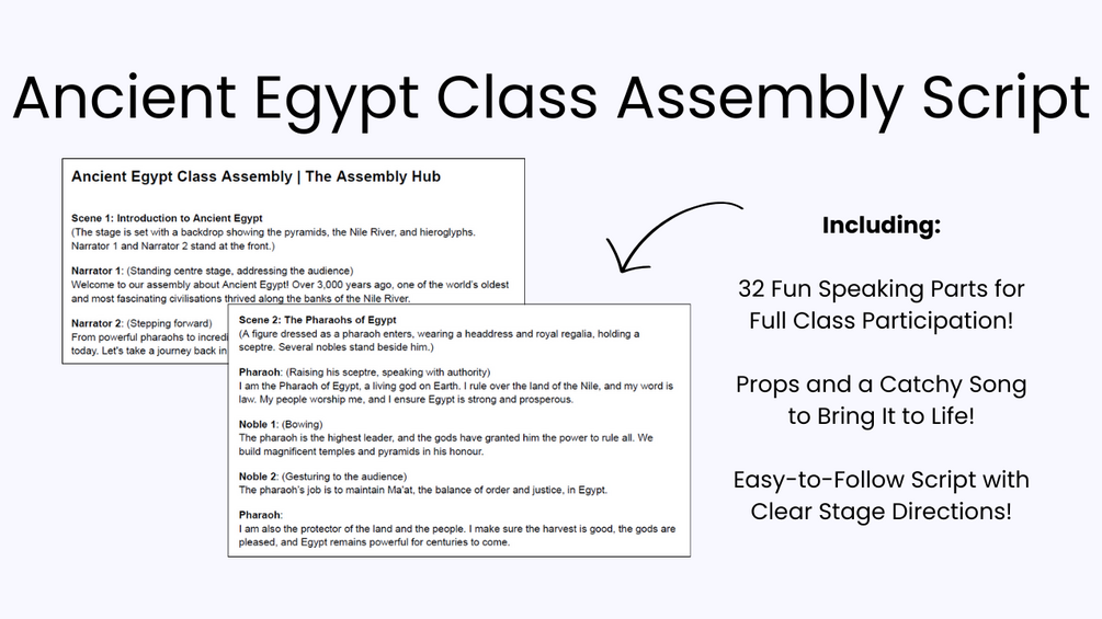 Transport your students to the time of the Ancient Egyptians with our Ancient Egypt Class Assembly Script! This engaging assembly pack features 32 speaking parts, making it ideal for the whole class to get involved in a fun, educational performance.