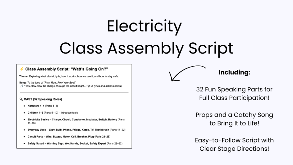 Transport your students into the world of science with our Electricity Class Assembly Script! This engaging assembly pack features 32 speaking parts, making it ideal for the whole class to get involved in a fun, educational performance.